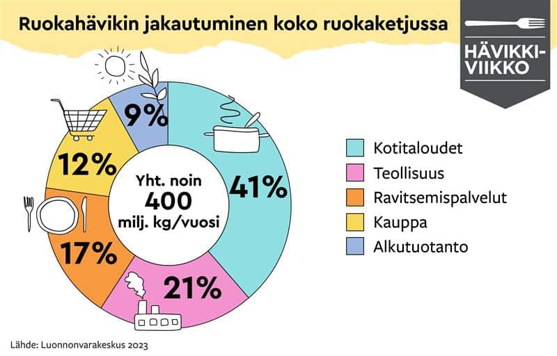 Syömäkelpoista ruokaa menee hukkaan kaikissa elintarvikeketjun vaiheissa. Ruokahävikkiä muodostuu niin ravitsemuspalveluissa, kaupoissa, teollisuudessa ja alkutuotannossa kuin kotitalouksissa. Koko ruokaketjun hävikin arvioidaan olevan lähes 400 miljoonaa kiloa vuosittain.