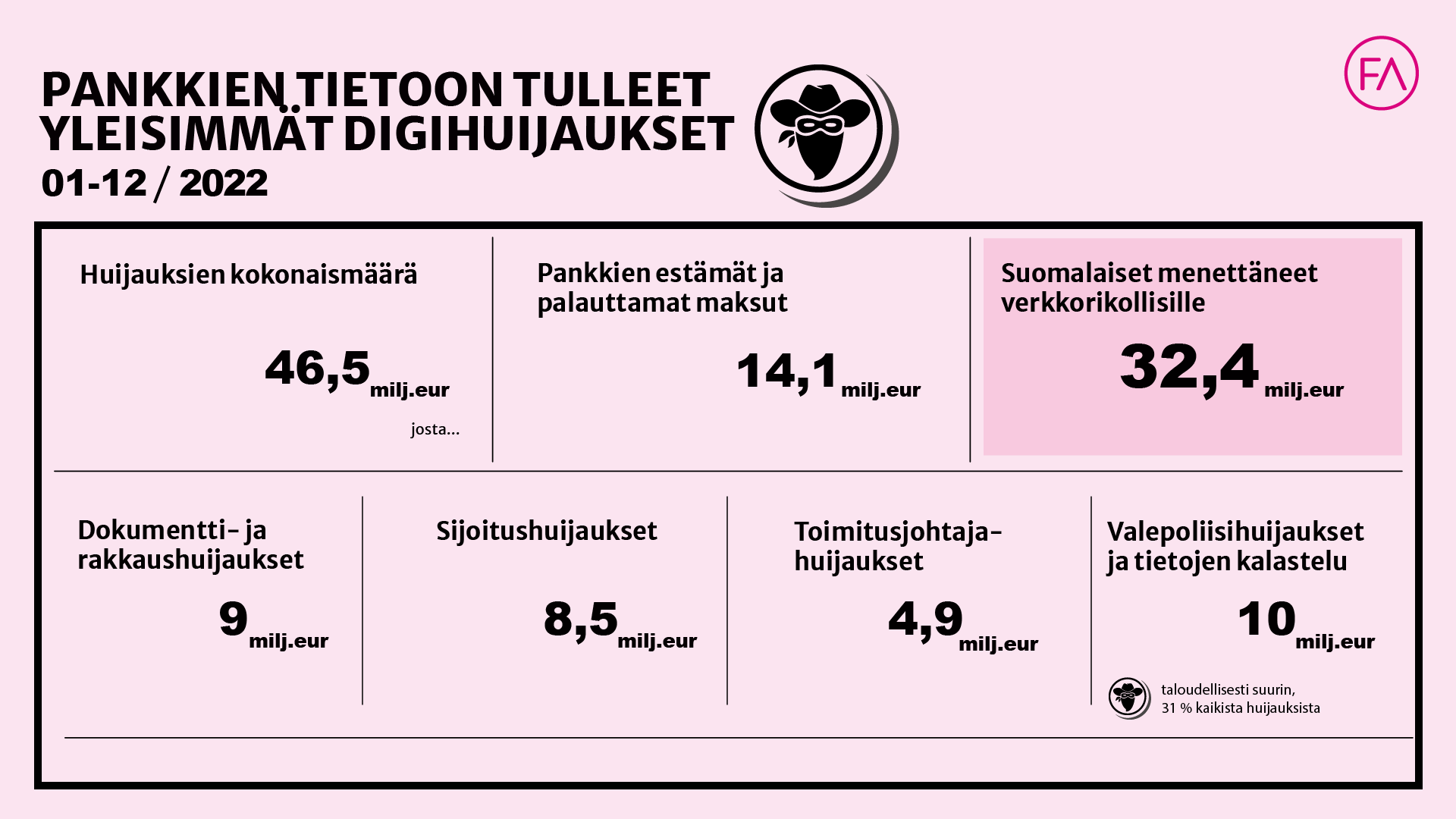 Suomalaiset menettivät vuonna 2022 niin sanotuissa dokumentti- ja rakkaushuijauksissa yhteensä 9 miljoonaa euroa, toimitusjohtajahuijauksissa 4,9 miljoonaa euroa ja sijoitushuijauksissa 8,5 miljoonaa euroa. Euromääräisesti suurimmat huijaukset, yhteensä 10 miljoonaa euroa, olivat valepoliisihuijauksia ja erilaisia tietojen kalasteluja. Niissä suomalaisilta huijattiin rahaa vuoden jälkimmäisen puoliskon aikana lähes neljä kertaa enemmän kuin vuoden ensimmäisellä puoliskolla. Myös muissa huijauksissa rahaa menetettiin selvästi enemmän vuoden jälkipuoliskolla.