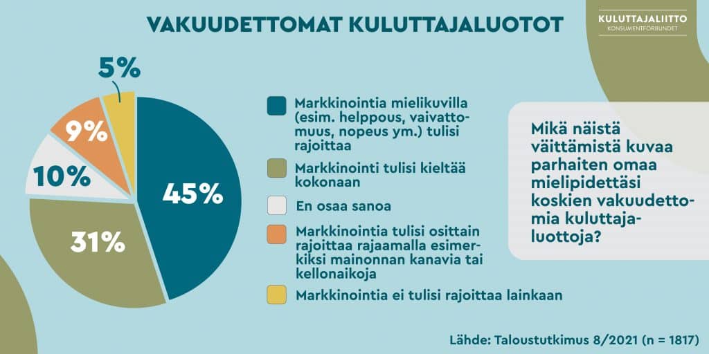 Kuluttajaliiton selvityksen mukaan (n = 1817) vastaajista valtaosa (85 %) kannatti rajoituksia vakuudettomien kuluttajaluottojen markkinointiin. Ensisijaisena keinona markkinoinnin kieltoa kokonaan kannatti 31 % vastaajista, mielikuvamarkkinoinnin rajoittamista 45 % vastaajista ja 9 % rajoittaisi mainontaa esimerkiksi rajaamalla mainonnan kellonaikoja tai kanavia. Vain 5 % ei rajoittaisi markkinointia lainkaan. Vielä kireämmän sääntelyn kannalla olivat vuoden sisällä vakuudetonta luottoa hakeneet. Heistä jopa 51 % kannatti rajoituksia lainojen mielikuvamarkkinointiin.