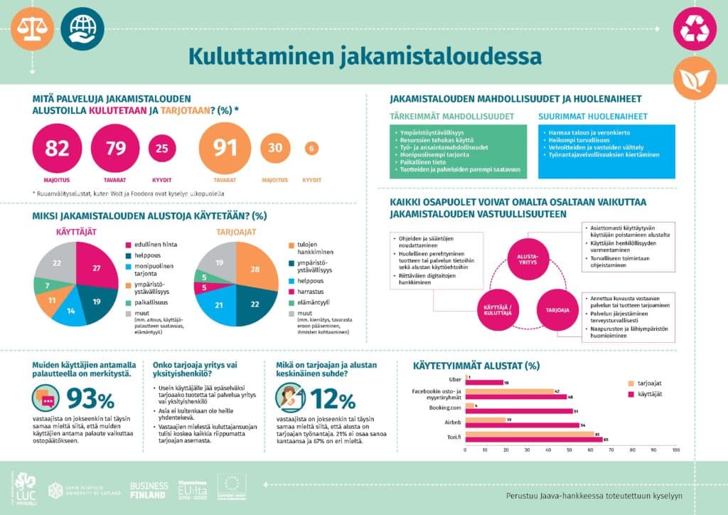 Alustoja on lukuisia ja ne eroavat toisistaan merkittävästikin, vaikka perusperiaatteeltaan ne toimivat samoin: alustat yhdistävät eri tuotteiden ja palveluiden kysynnän ja tarjonnan myös yksityishenkilöiden välillä. Ehkäpä vastaaminen olisi ollut yksinkertaisempaa, jos kysely olisi koskenut vain yhtä alustapalvelua. Vaikuttaa joka tapauksessa siltä, että vastaajat tunnistivat alustayrityksen ja tarjoajan keskeisiksi vastuutoimijoiksi, mutta käyttäjän roolissa olevia kuluttajia ei mielletty jakamistalouden vastuullisuuden kannalta olennaiseksi tahoksi. Jakamistalous ja alustayritysten toimintamallit ovat kuitenkin siirtäneet perinteisesti yrityksille kuuluvia vastuuosuuksia kuluttajille. Tämä koskee sekä perinteisessä kuluttajan roolissa toimivaa että tarjoajan saappaisiin astunutta kuluttajaa.