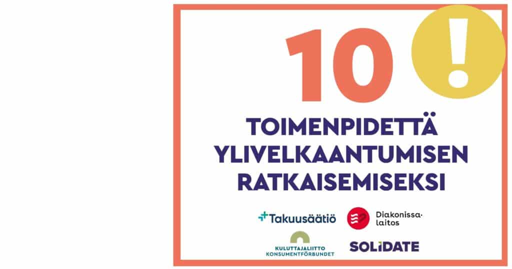 Diakonissalaitos, Kuluttajaliitto, Takuusäätiö ja Solidate ovat käyneet aktiivista vuoropuhelua tutkijoiden, päättäjien sekä ylivelkaantuneiden kokemusasiantuntijoiden kanssa. Autamme myös päivittäin ylivelkaantuneita. Julkaistut kymmenen toimenpidettä pohjautuvat näihin keskusteluihin sekä omassa työssämme esiin nousseisiin kokemuksiin.