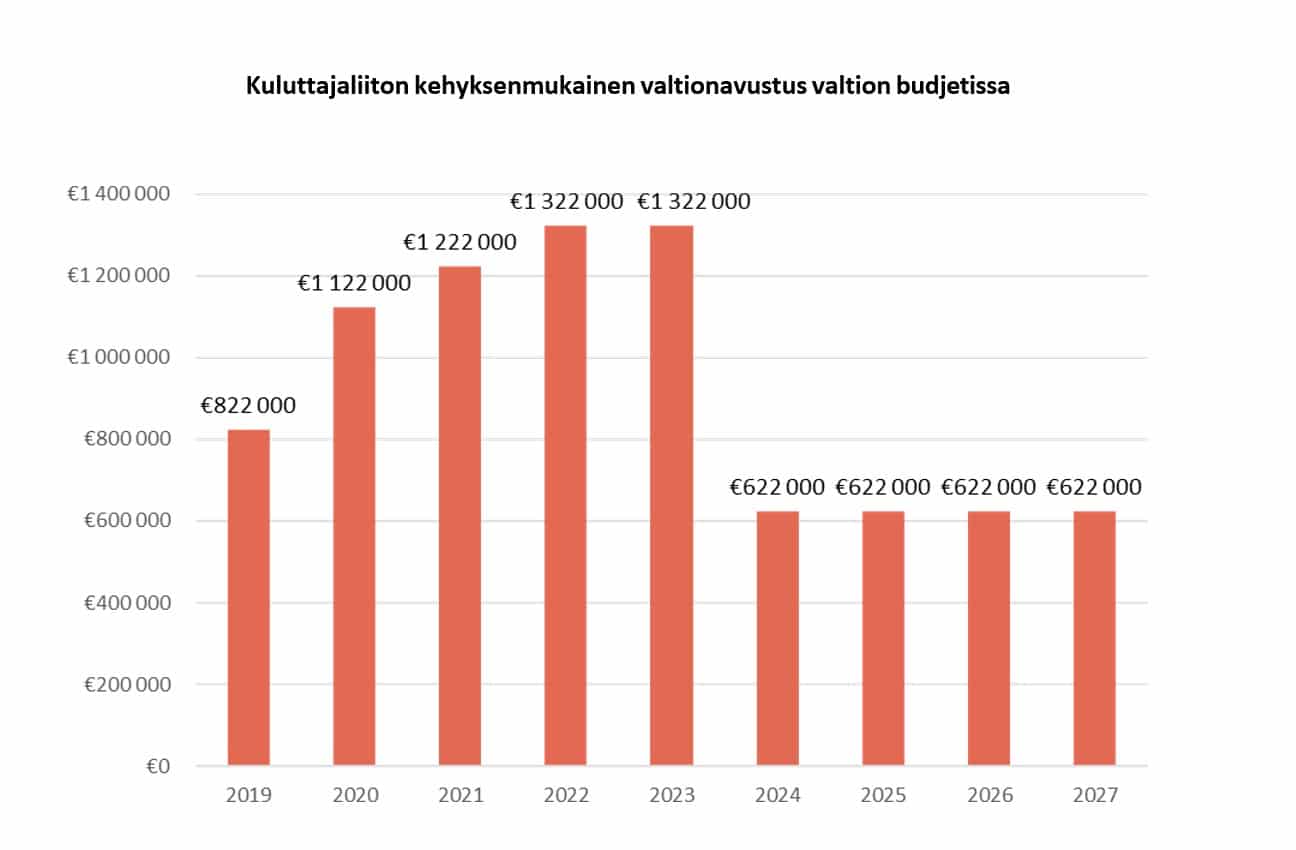 Kehyksenmukaisen avustuksen lisäksi eduskunta myönsi vuodelle 2023 lisärahoitusta 150 000 euroa. Valtionavustuksen vaiheittainen myönteinen kehitys on mahdollistanut liiton toiminnan monipuolisen kehittämisen ja kuluttajien etujen edistämisen niin kansallisella, alueellisella kuin kansainväliselläkin tasolla.