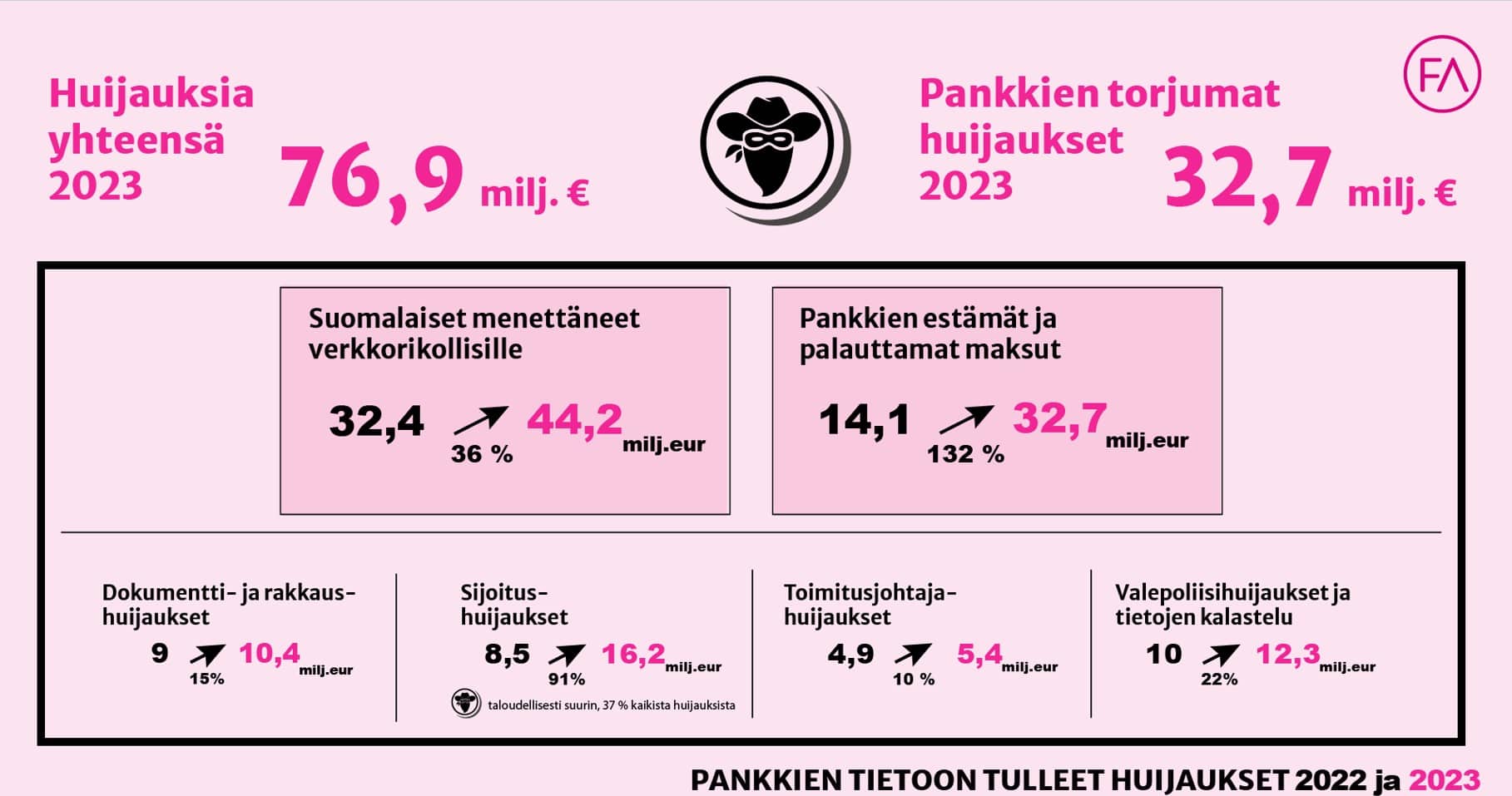 Suomalaiset menettivät huijareille vuonna 2023 noin 44,2 miljoonaa euroa, joka on 36 % enemmän kuin vuonna 2022. Pankit ovat pystyneet omilla toimillaan estämään rahansiirtoja huijareiden tileille enemmän kuin koskaan, mutta siitä huolimatta rahanmenetykset ovat valtavia. Tilastotkin saattavat kertoa vasta jäävuoren huipun, sillä moni huijaus jää merkitsemättä ylös.