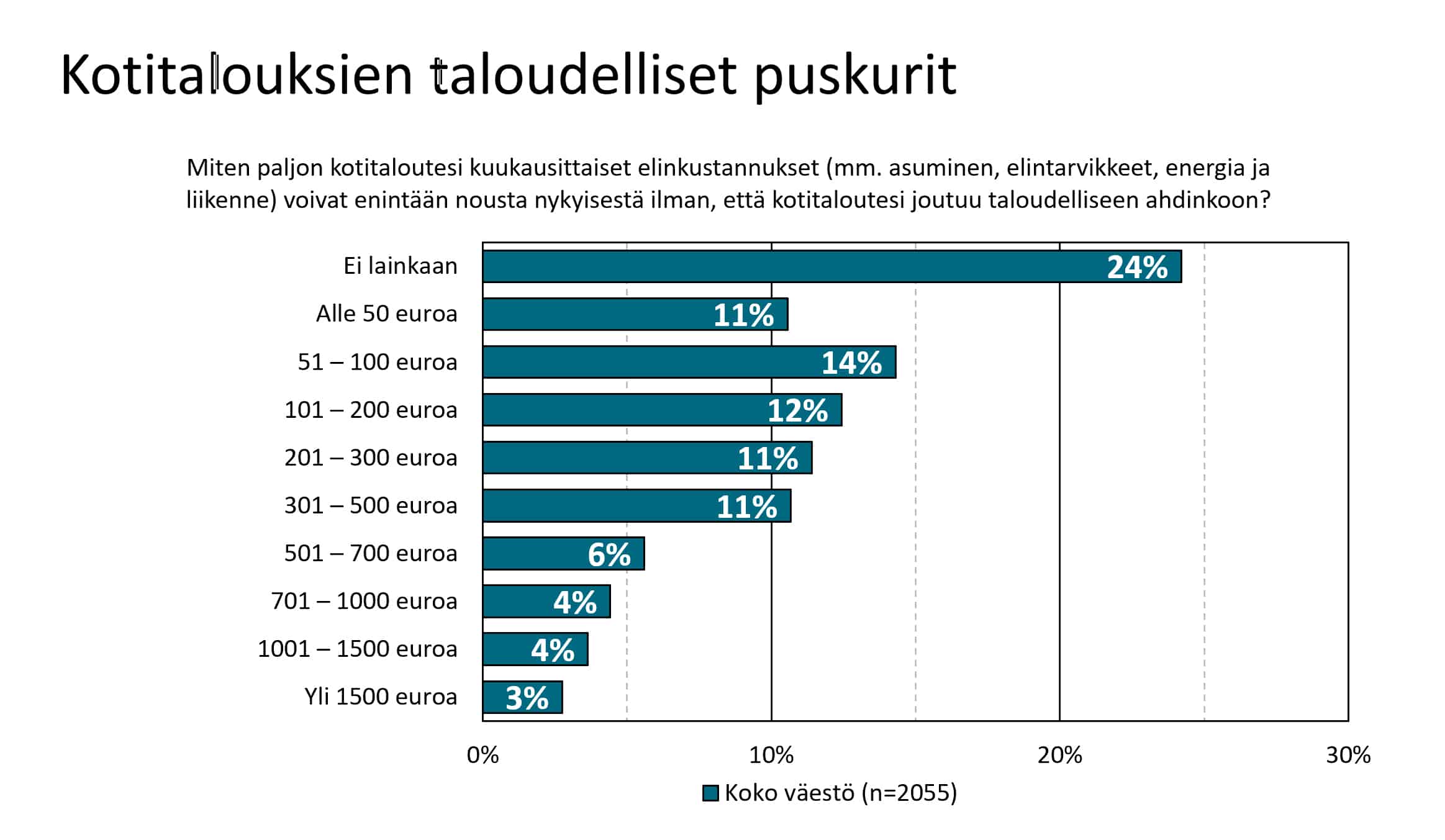 Erittäin haasteellinen taloustilanne kurittaa joka neljättä suomalaista, selviää vuodenvaihteessa teettämästämme kyselytutkimuksesta.1 Neljännes vastaajista ilmoitti, ettei oma talous kestä enää lainkaan menojen kasvua. Viime vuosien tapahtumat ovat saaneet kuluttajat myös punnitsemaan menojaan entistä tarkemmin. Noin neljännes (24 %) kuluttajista on jämähtänyt krooniseen rahapulaan, jossa kuukausittaiset kulut eivät voi vastaajan oman arvion mukaan nousta enää lainkaan. Elinkustannusten nousu erityisesti energiakustannusten, ruoan hinnan sekä asuntolainojen korkomenojen osalta rasittaa kotitalouksien arkea. Hankalin tilanne selvityksen mukaan on yksinasuvilla, yksinhuoltajilla, pienituloisilla sekä vuokra-asunnossa asuvilla. Arvonlisäveron korotuksen suhteellinen vaikutus kohdistuu eniten juuri näihin samoihin kuluttajaryhmiin.