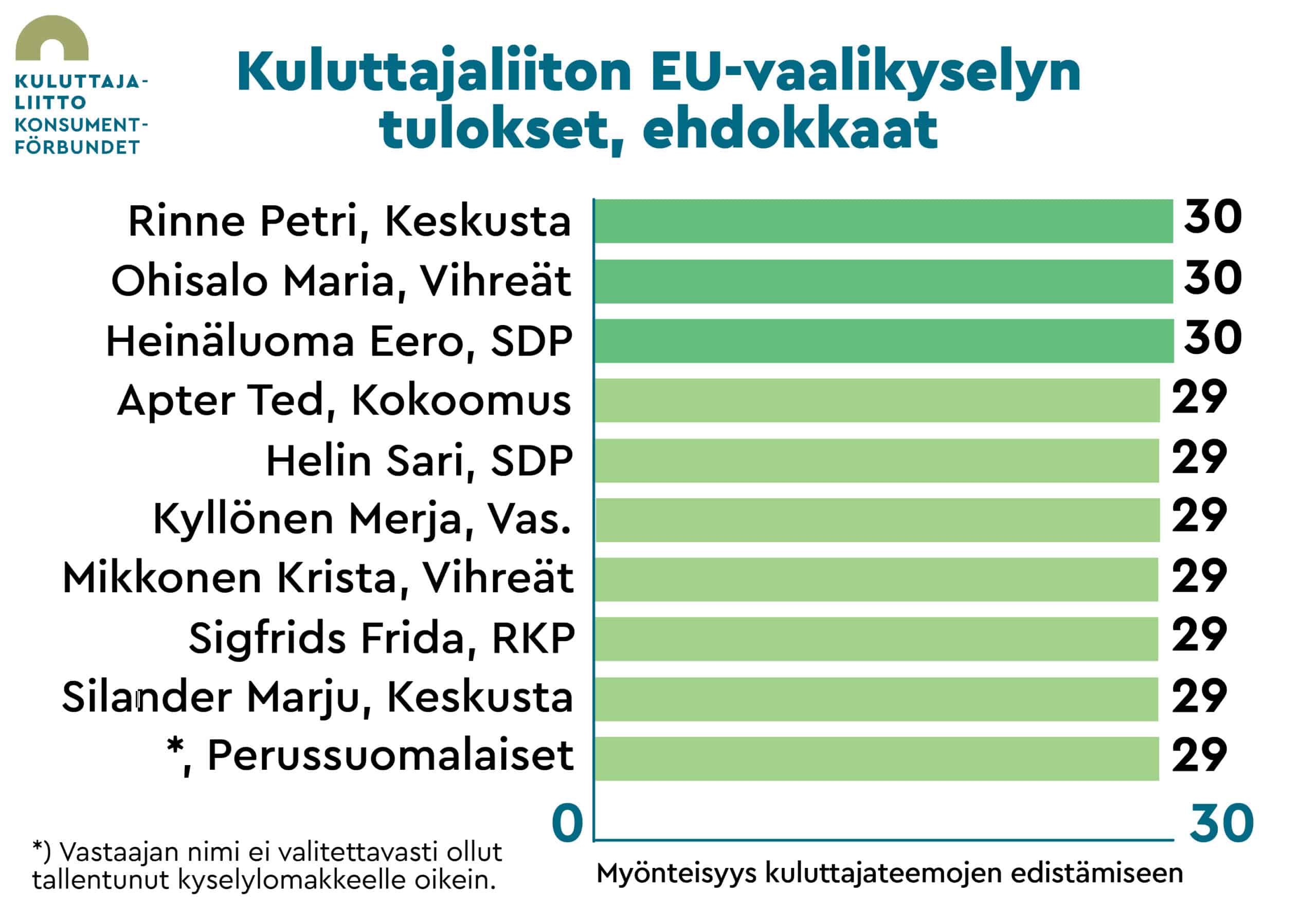 Yksittäisistä ehdokkaista Kuluttajaliiton tavoitteiden kanssa eniten samoilla linjoilla olivat Petri Rinne (Keskusta), Maria Ohisalo (Vihreät) ja Eero Heinäluoma (SDP).