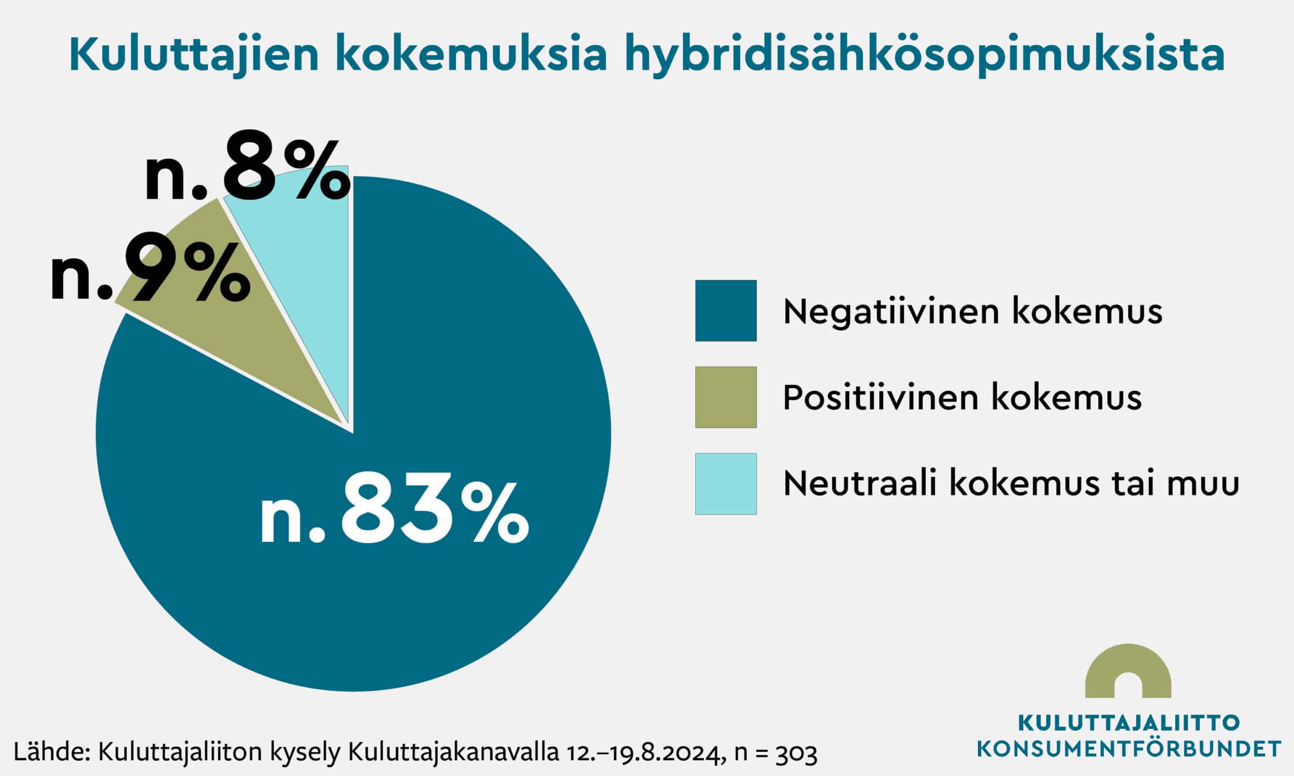 ”Yhteensä 250 vastaajaa (n. 83 %), raportoi negatiiviseksi luokiteltavasta kokemuksesta hybridisähkösopimukseen liittyen”, kertoo Kuluttajaliiton pääsihteeri Juha Beurling-Pomoell. 28 vastaajaa (n. 9 %) puolestaan oli tyytyväisiä sopimustyyppiin. 25 kpl (n. 8 %) vastauksista oli neutraaleja. Kursiivilla olevat tekstit ovat lainauksia kyselyn vastauksista.