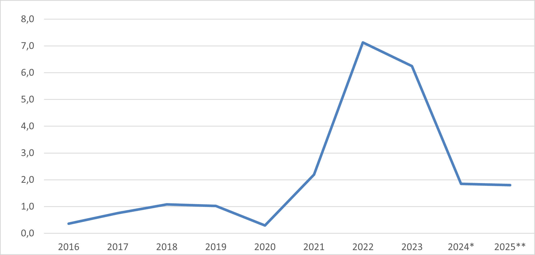 Lähde: 2016–2024/7 Tilastokeskus, 2024/8- kirjoittajan oma arvio Valtiovarainministeriön ennustetta mukaillen.