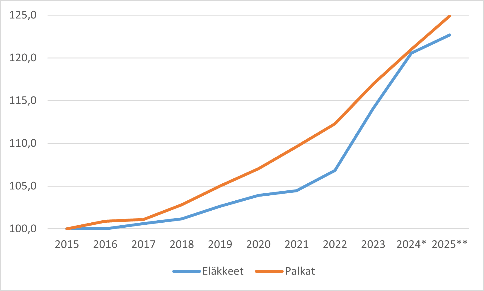 Kuvio 2. Palkkojen ja työeläkkeiden kehitys 2015–2025*, 2015=100