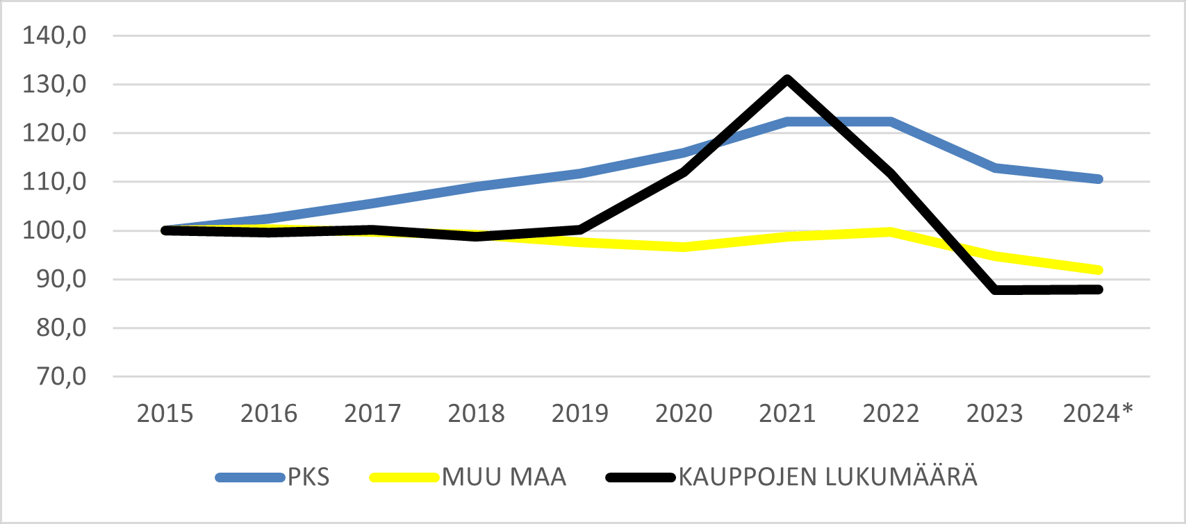 Kuvio 1. Vanhojen osakeasuntojen hintaindeksi pääkaupunkiseudulla ja muualla maassa sekä kauppojen kokonaismääräindeksi 2015–2024*, 2015=100
