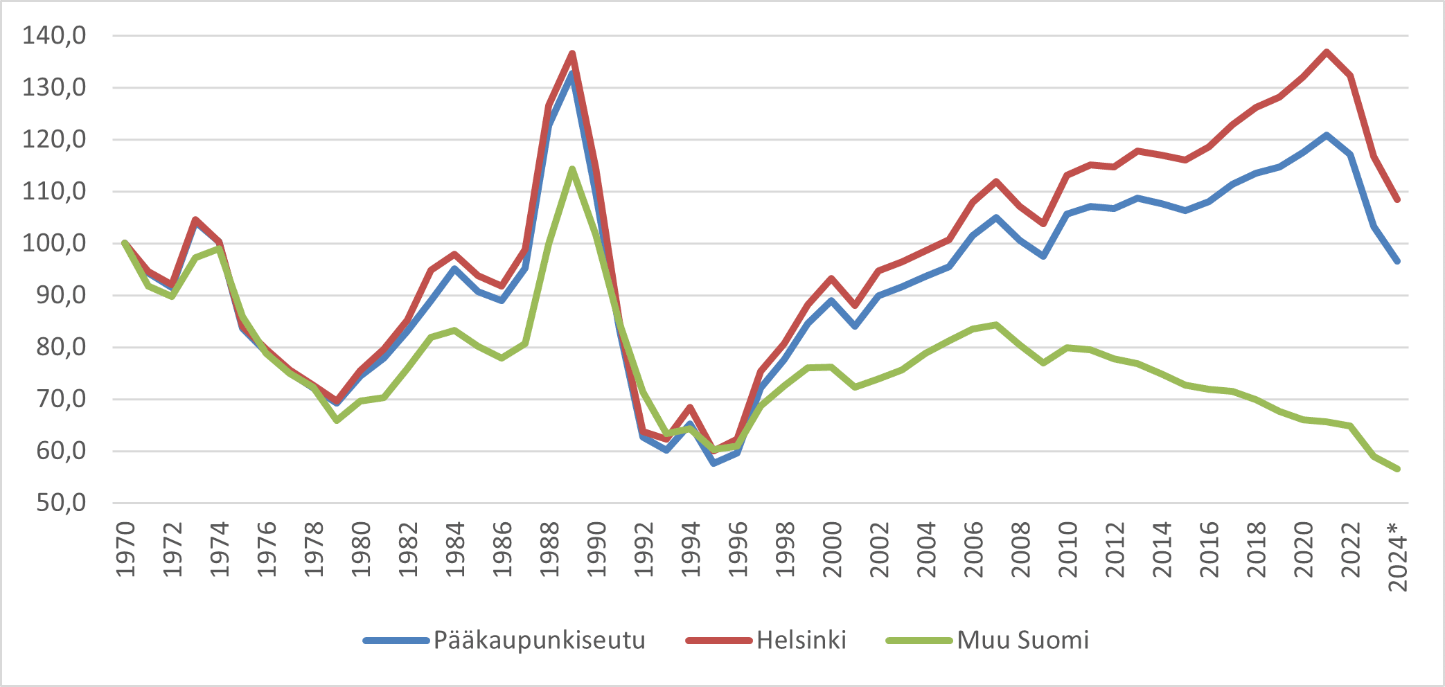 Kuvio 2. Vanhojen osakeasuntojen hintakehitys suhteessa palkkojen kehitykseen Pääkaupunkiseudulla, muualla Suomessa ja Helsingissä 1970–2024*, 1970=100