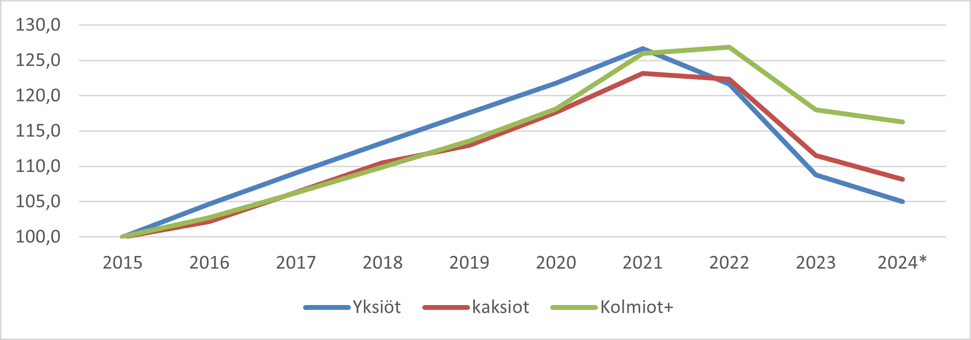 Pääkaupunkiseudulla yksiöiden ja suurempien perheasuntojen hinnat nousivat vuosina 2015–2021 saman verran, reilut 26 prosenttia. Huippuvuodesta 2021 yksiöiden hinnat ovat laskeneet 18, kaksioiden 16 ja perheasuntojen 13 prosenttia. (Kuvio 3). Tänä vuonna yksiöiden, kaksioiden ja perheasuntojen hinnat laskevat 4–5 prosenttia edellisvuodesta. Hintojen lasku on hiipumassa vuoden loppupuolella ja varsinkin isompien asuntojen hinnat ovat pienoisessa nousussa.
