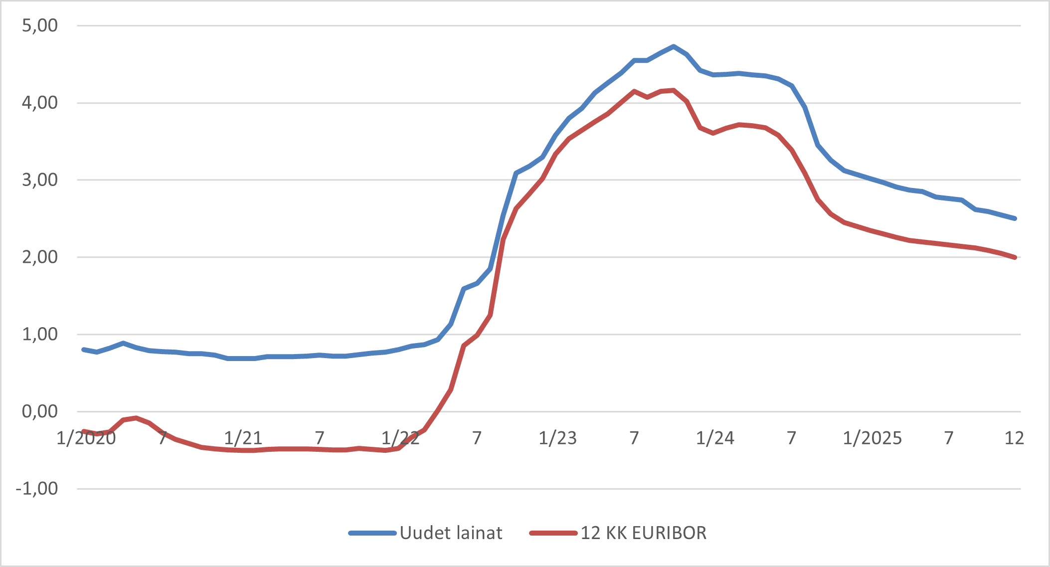 Kuvio 4. Uusien asuntolainojen ja 12 kuukauden euriborin korkokehitys vuodesta 2020 vuoden 2025* loppuun