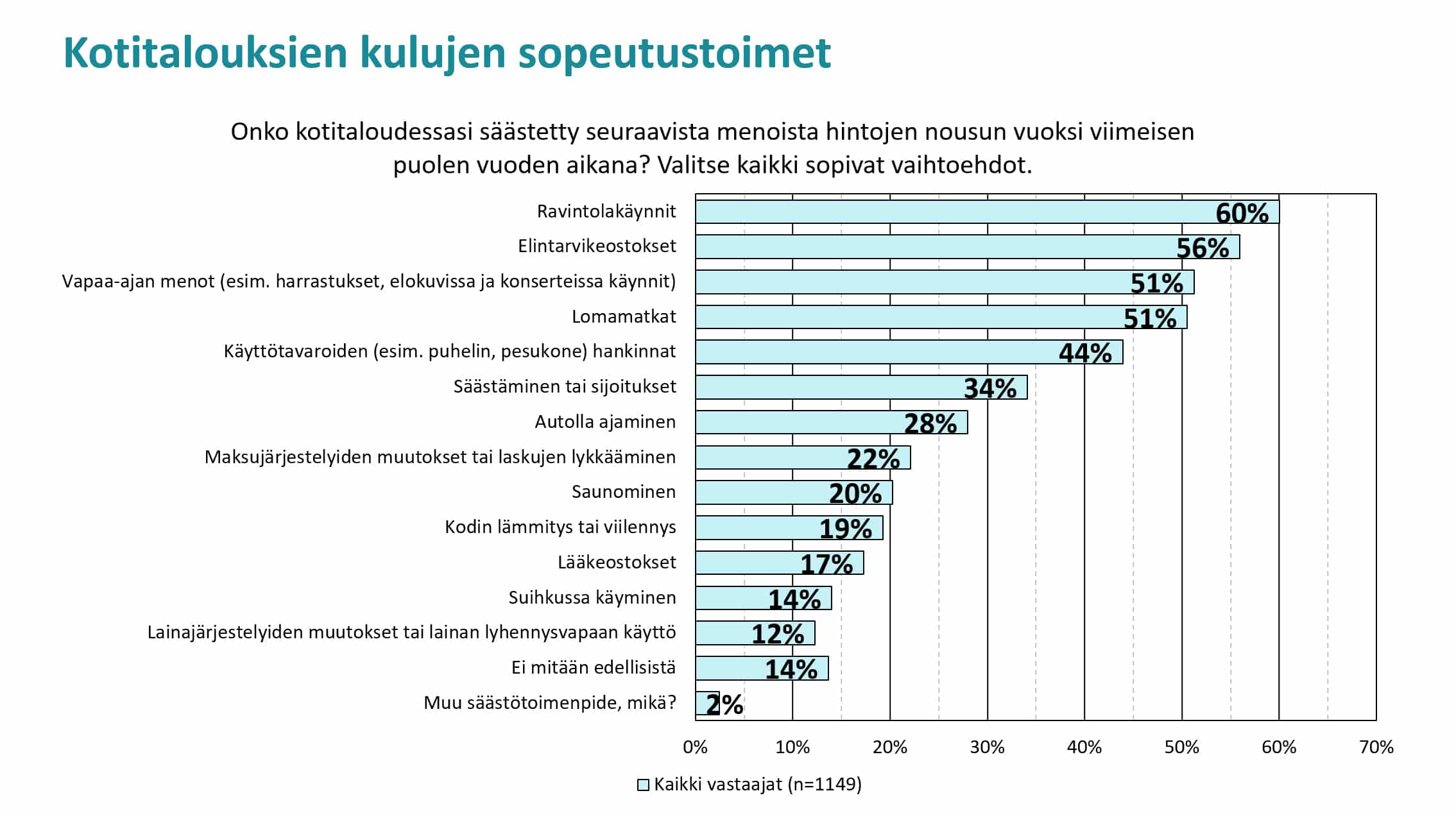 Kuluttajaliiton kyselyyn vastanneet ilmoittivat säästäneensä etenkin ruokaan liittyvistä menoista viimeisen puolen vuoden aikana. Reilusti yli puolet vastaajista kertoi karsineensa ravintolakäyntejä ja ruokaostoksia hillitäkseen kotitalouden menoja. Noin puolet on tinkinyt myös lomamatkoista ja vapaa-ajan menoista. Kuluttajaliiton kyselyyn vastasi 1149 kuluttajaa.