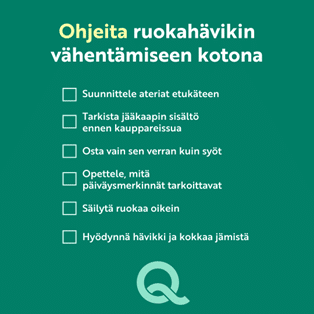 Suomessa kotitalouksissa syntyy lähes 40 % koko ruokaketjun hävikistä. Suunnittelemalla viikon ateriat pääset jo alkuun. Muista myös tarkistaa jääkaapin sisältö ennen kauppareissua (ota vaikka kuva!) ja varmista miten eri ruoka-aineet säilyvät parhaiten. Voit myös ottaa alta talteen vinkkilistan, joka auttaa vähentämään ruokahävikkiä kotona!