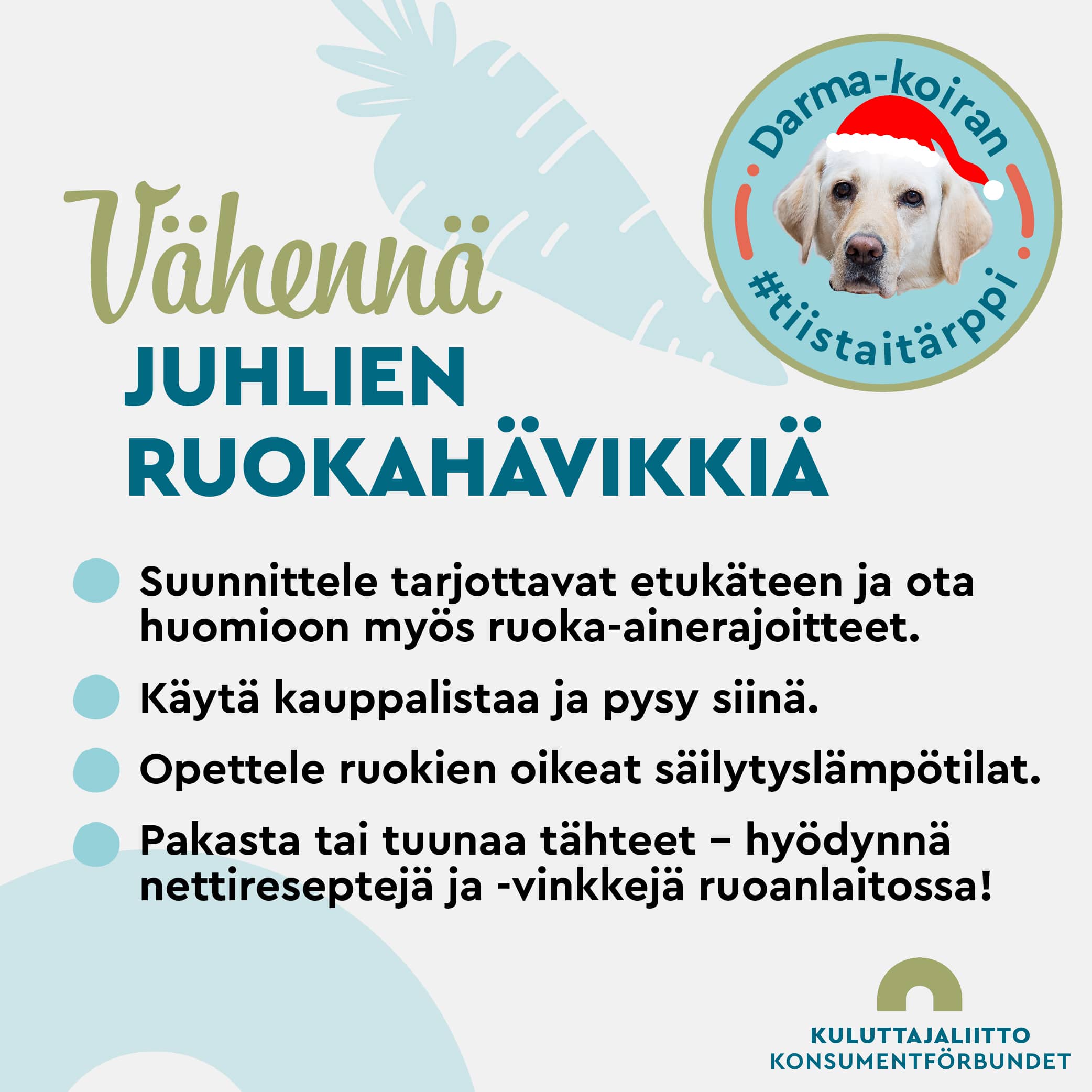 Meneekö teillä pikkujouluissa ja joulun aikaan paljon ruokaa roskiin? Ruokahävikillä tarkoitetaan ruokaa, joka on alun perin ollut syömäkelpoista, mutta joka syystä tai toisesta päätyy roskiin tai biojätteeksi. Vaikka Darma syökin hyvin mieluusti kaikki tähteet, hän suosittelee silti ruokahävikin hillitsemistä mm. suunnittelemalla tarjottavat ruoat ja ostokset etukäteen.