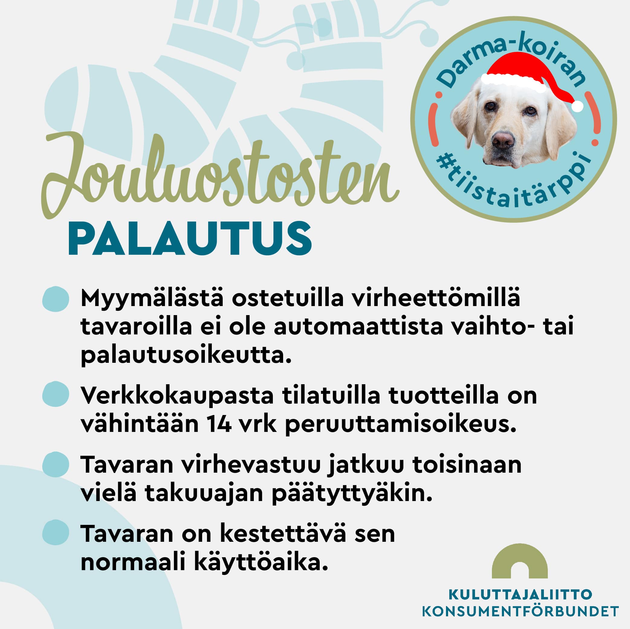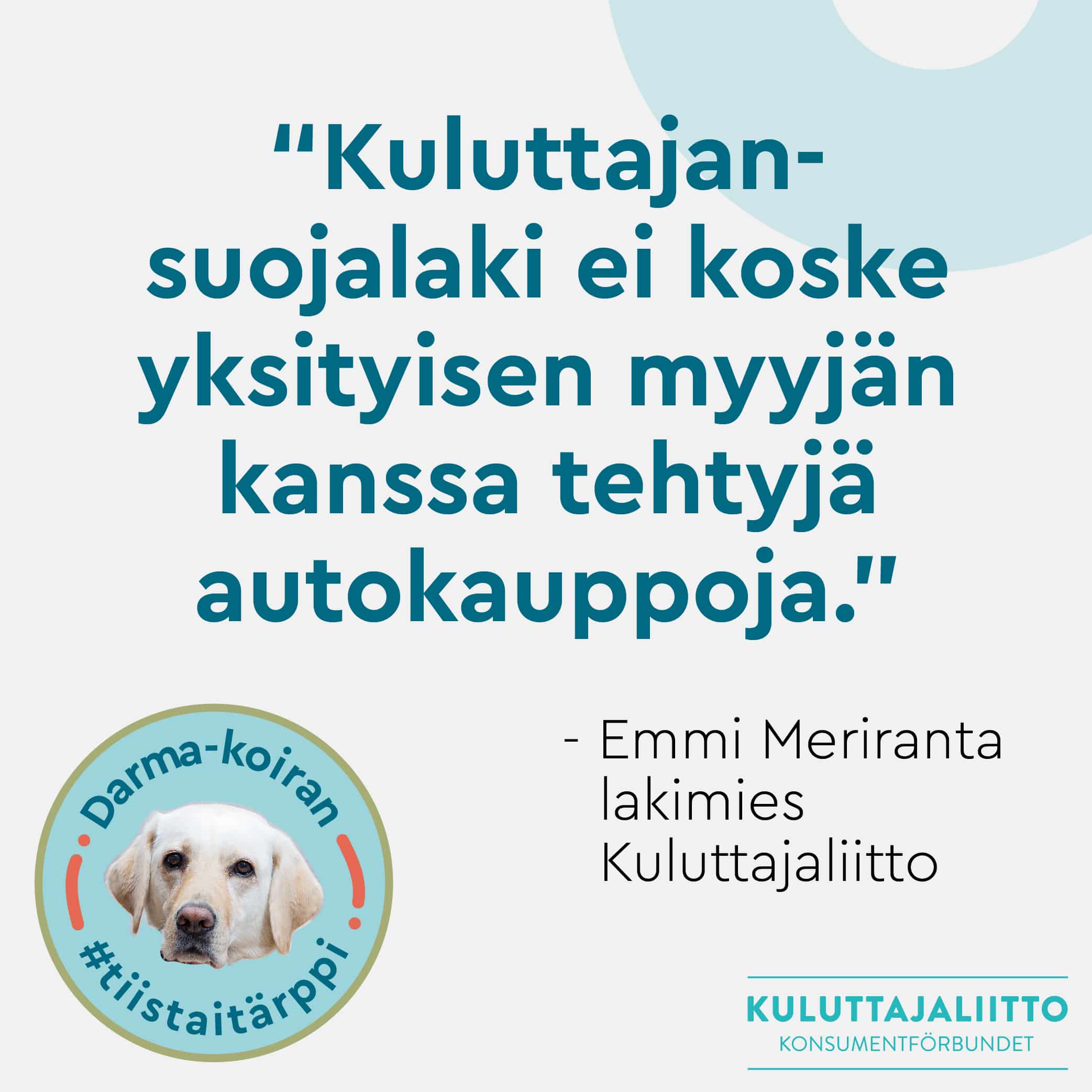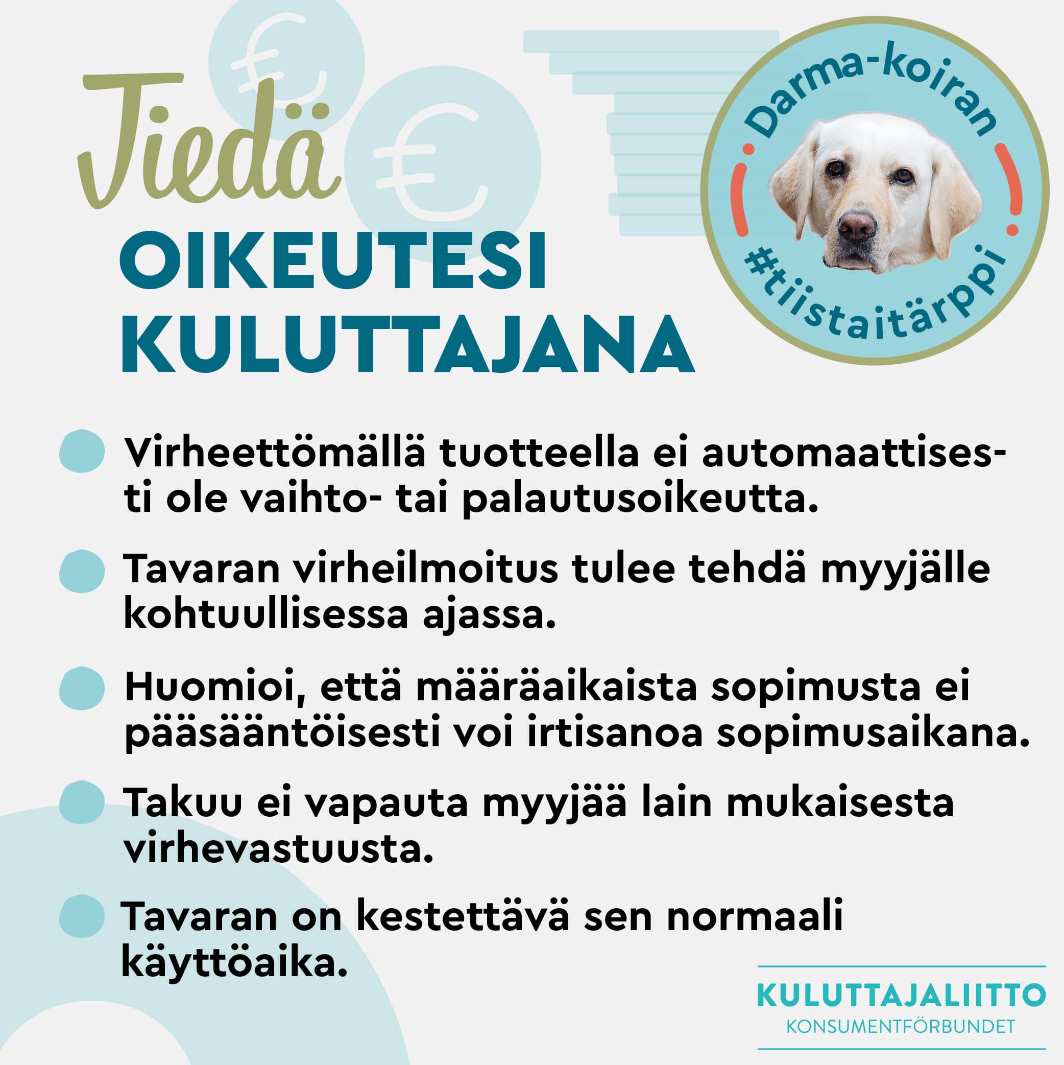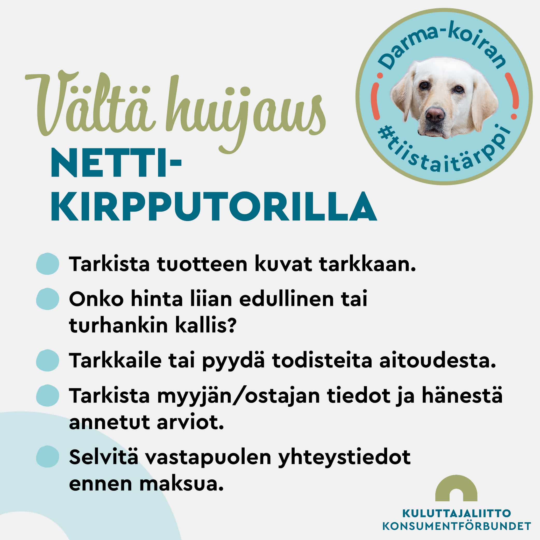 Kuluttajaliiton viikoittaisissa tiistatärpeissä jaamme ajankohtaista ja mielenkiintoista tietoa kuluttajaa koskevista asioista pääsihteerimme neuvonantajan, suloisen Darma-koiran avustuksella. Haluatko tietää lisää Darmasta? Tutustu Darmaan!