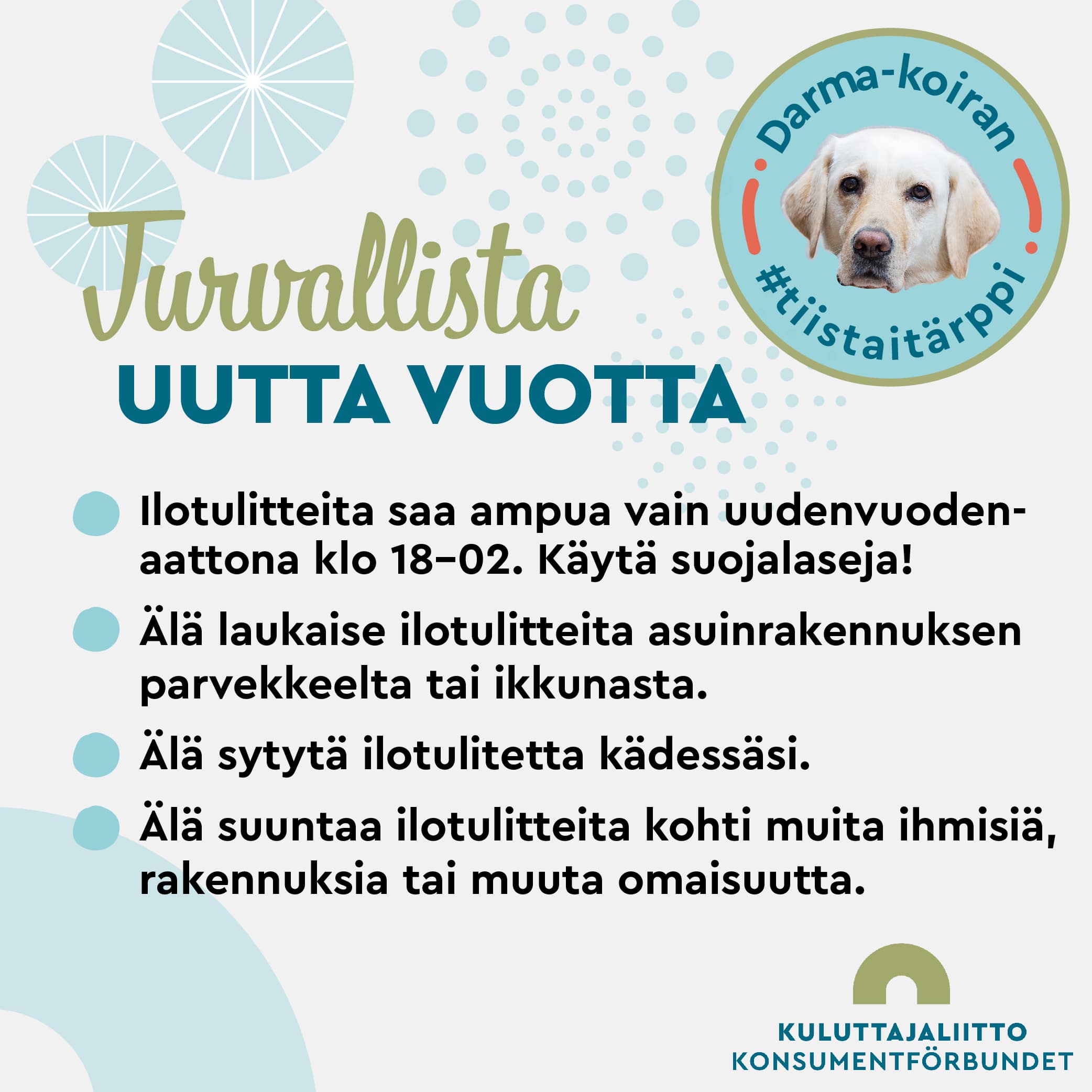 - Ilotulitteita saa ampua vain uudenvuodenaattona klo 18–02. (Darma pyytää noudattamaan tätä sääntöä kaikkien kanssaeläinten puolesta!) Käytä suojalaseja.