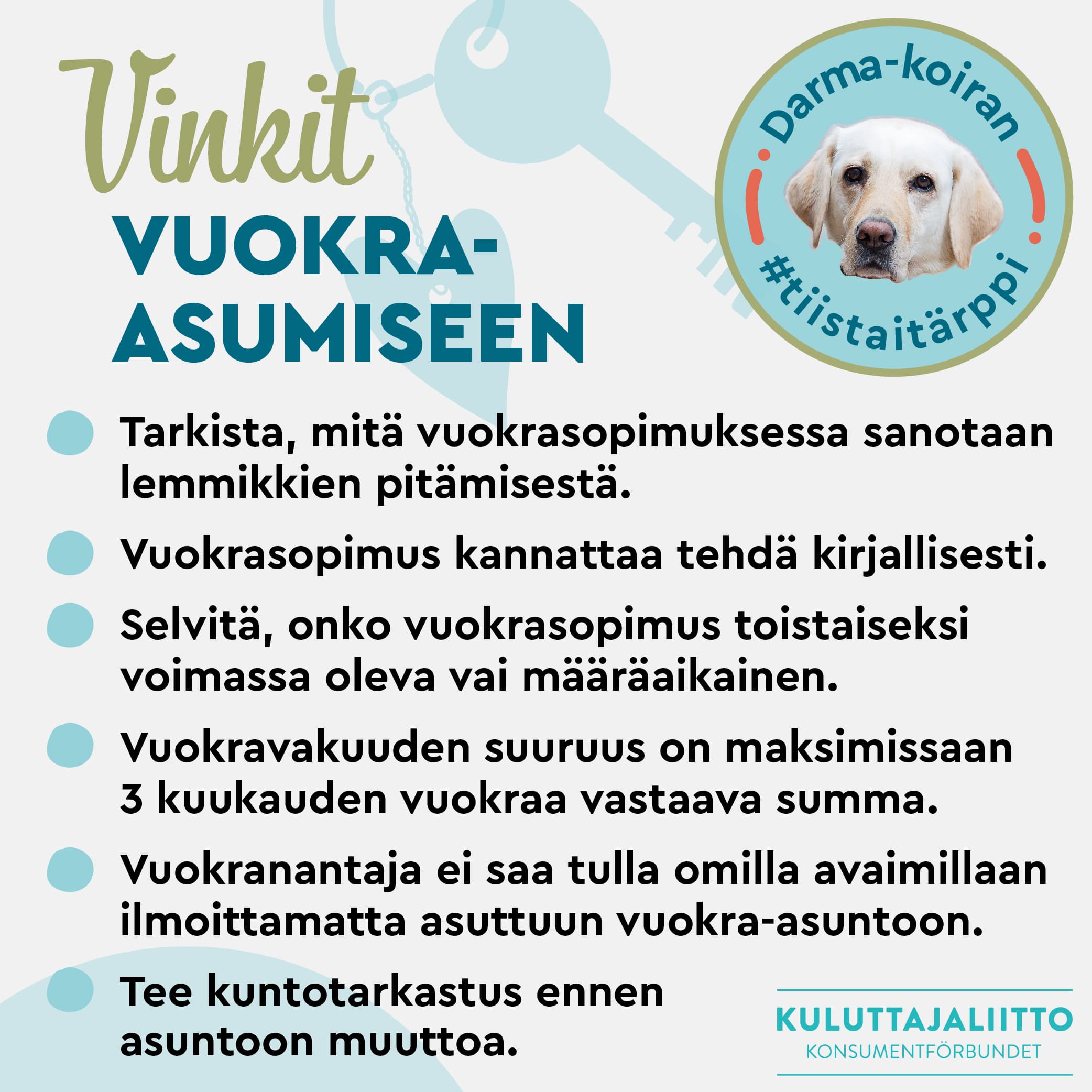 - Vuokranantaja ei saa tulla omilla avaimillaan ilmoittamatta asuttuun vuokra-asuntoon. Käynnistä pitää aina sopia etukäteen vuokralaisen kanssa.