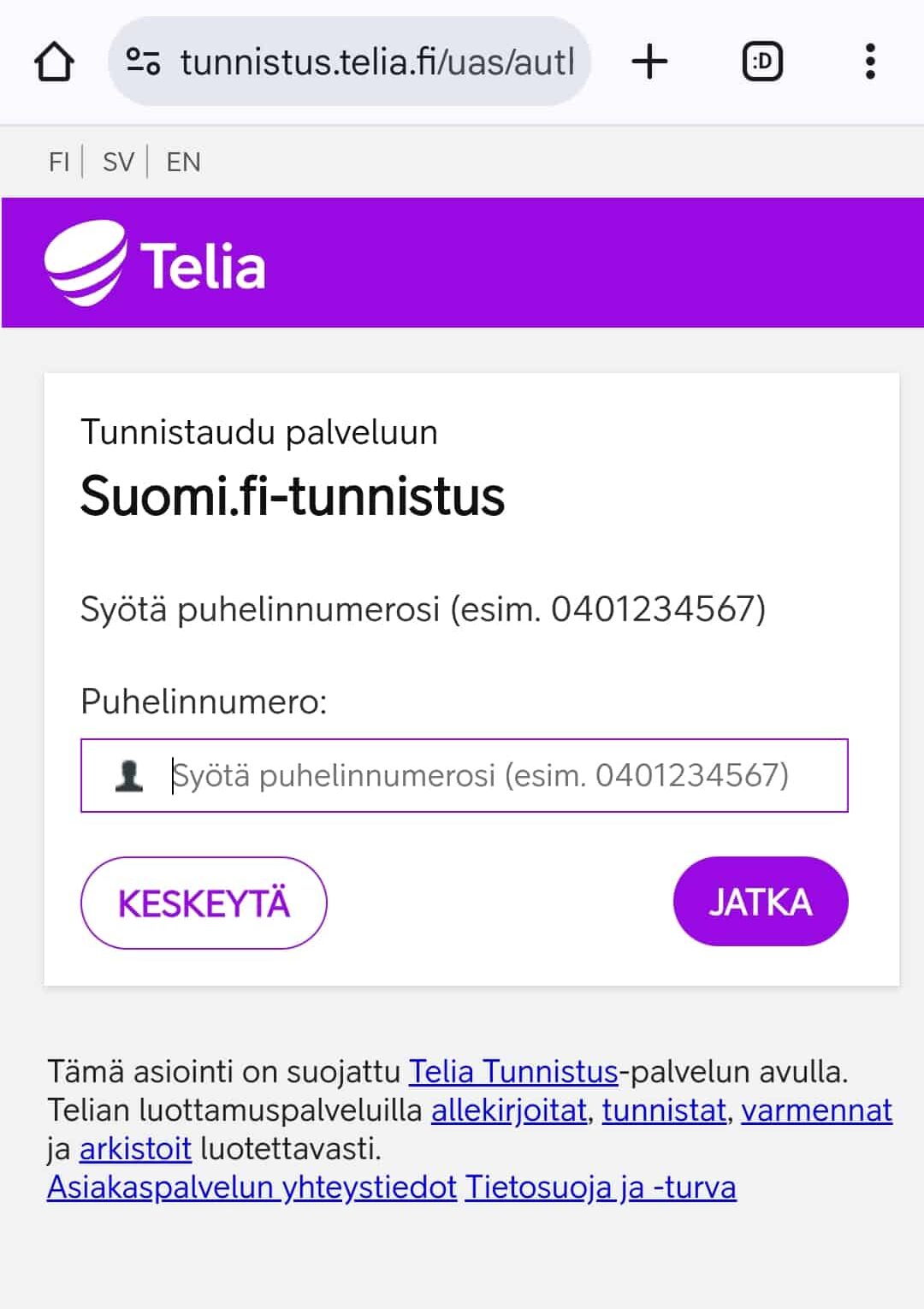 - Syötä kirjautumissivulle puhelinnumerosi (ks. kuva alla).