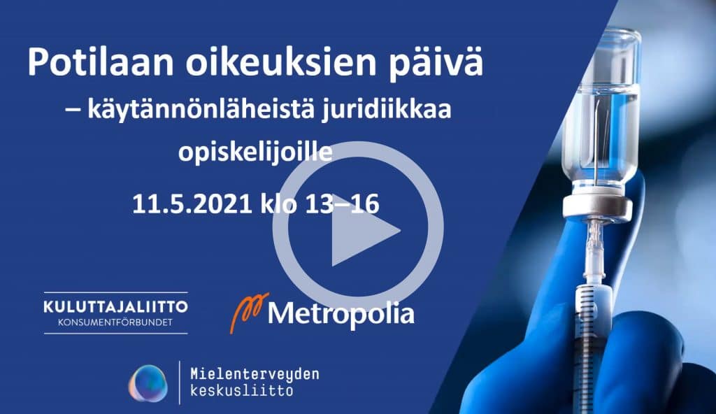 Kuluttajaliitto, Metropolia ja Mielenterveyden keskusliitto järjestivät sosiaali- ja terveydenhuollon opiskelijoille suunnatun virtuaalisen teemapäivän potilaan oikeuksista 11.5.2021. Koostimme lyhyen tiivistelmän tilaisuuden esityksistä.