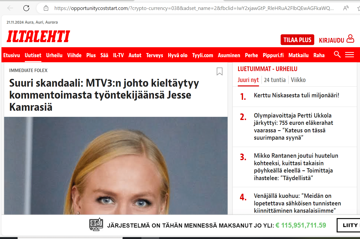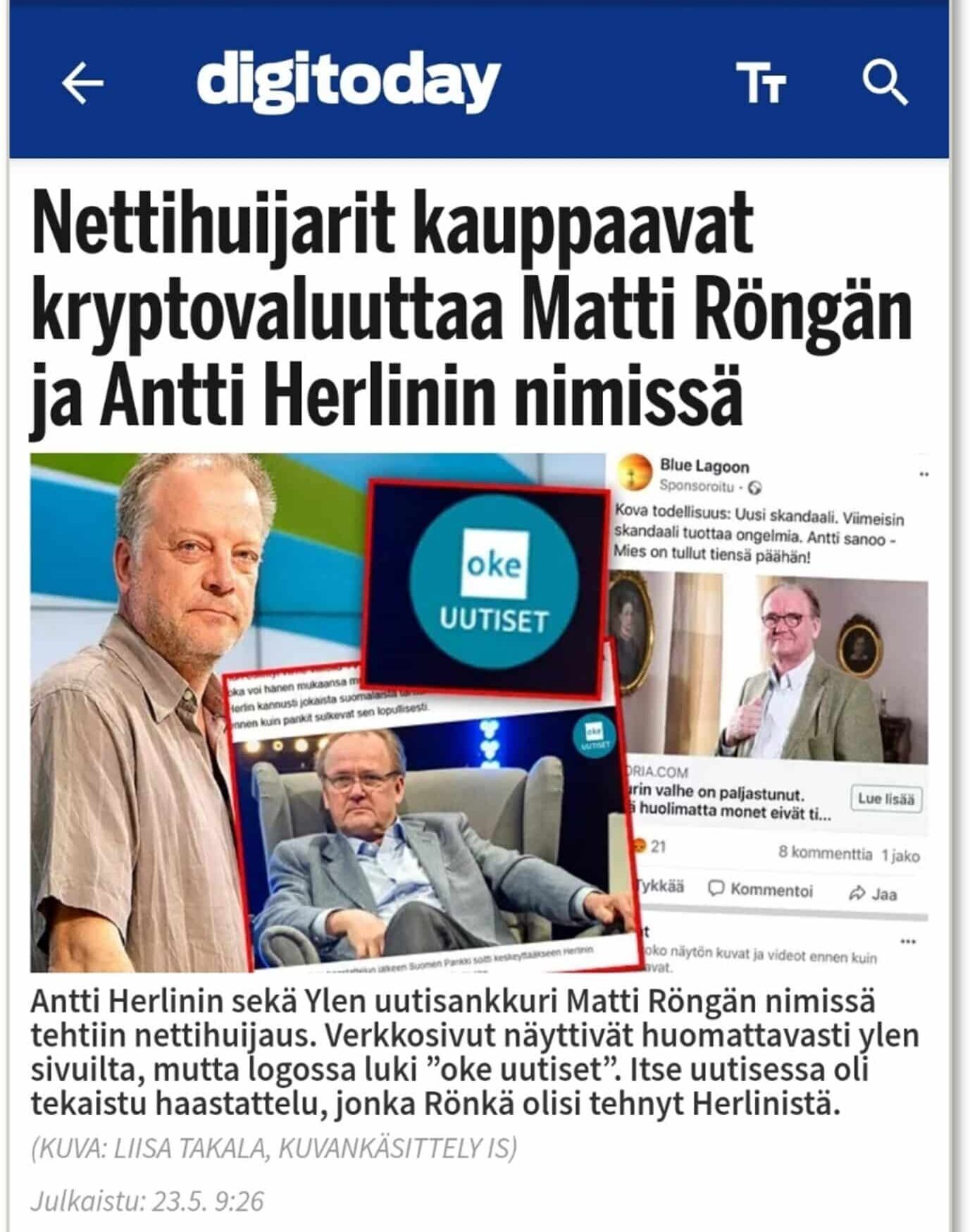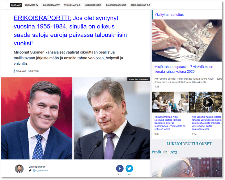 Somessa saatetaan mainostaa keksittyjä artikkeleita ja uutisia, joissa kerrotaan, kuinka suomalaiset julkisuudesta tutut henkilöt ovat sijoittaneet esimerkiksi tiettyyn kryptovaluuttaan ja saaneet niistä suuria voittoja. Uutisissa on linkkejä sivustoille, joilla sijoituksia voi tehdä, mutta rahat menevät sijoitusten sijaan rikollisten taskuun. Todellisuudessa nämä henkilöt eivät ole olleet missään tekemisissä kyseessä olevan huijauksen tai sijoitusten kanssa. Tunnettujen henkilöiden lisäksi jutuissa käytetään usein myös tuttujen yritysten nimiä ja ulkoasua: valesivustoja on tehty näyttämään mm. Ylen, Helsingin Sanomien ja Iltalehden sivuilta.