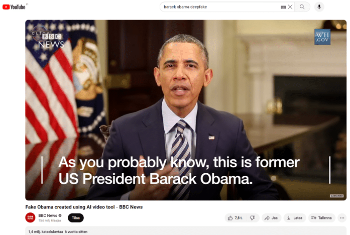 - Esimerkiksi Yhdysvaltain entisistä presidenteistä Barack Obamasta ja Donald Trumpista on tehty deepfake-videot.
