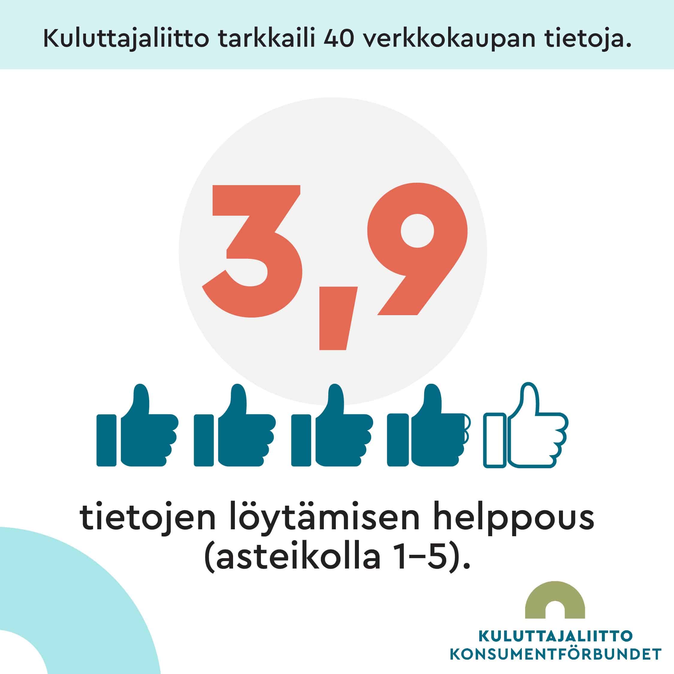 Tarkkailijan omaa kokemusta tietojen löydettävyydestä pisteytettiin asteikolla 1–5 (5 = erittäin helppoa ja 1 = tietoja ei yleisesti löytynyt). Tarkkailijan kokemuksen perusteella kaikkien kauppojen osalta tietojen löytämisen helppous sai keskiarvoksi 3,9. Yhteensä 13 kauppaa sai helppoudesta täydet pisteet ja vain neljä verkkokauppaa sai ainoastaan 1–2 pistettä.