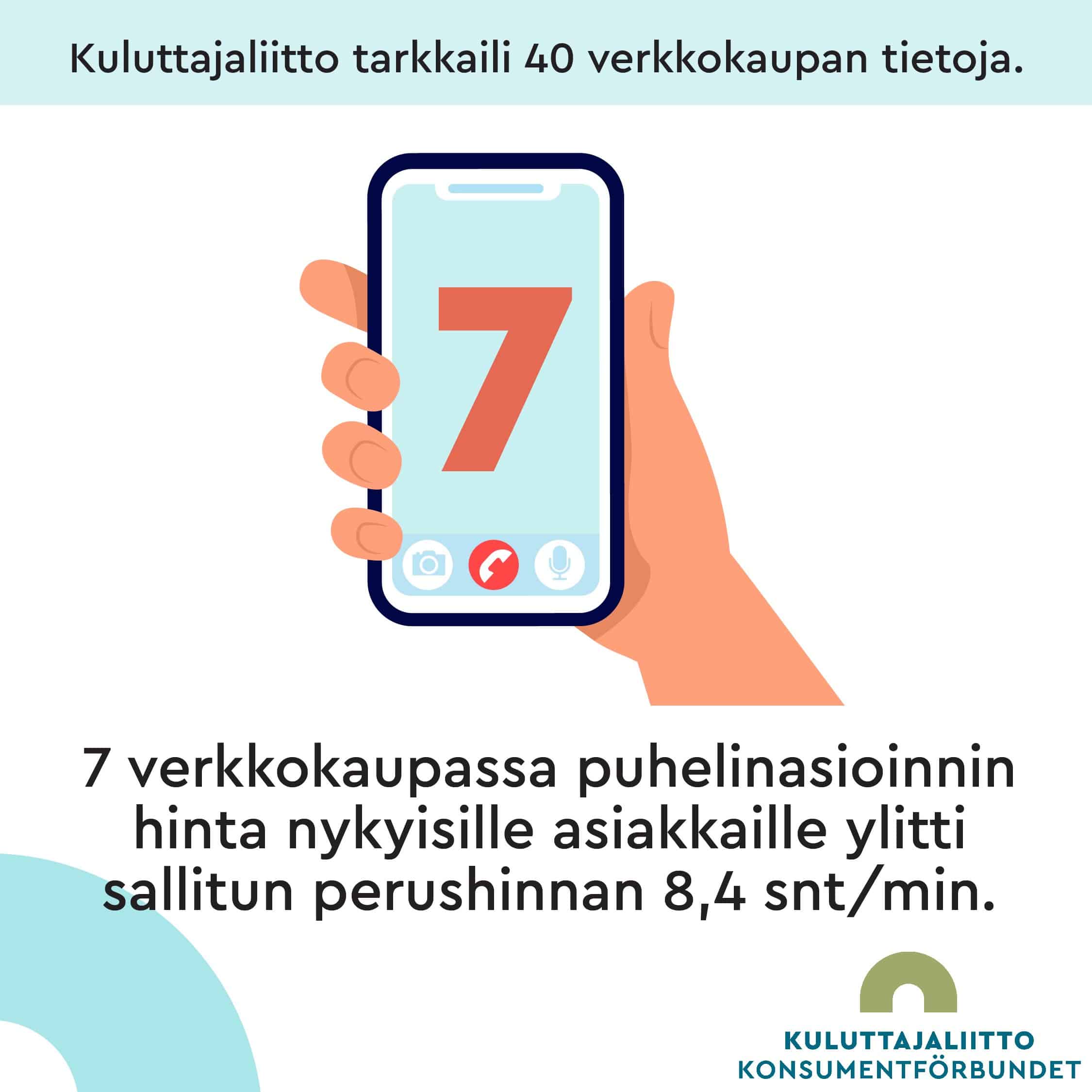 Yhteensä 7 verkkokaupassa edullisemman puhelinnumeron löytäminen ei onnistunut ja puhelinasioinnin hinta ylitti siis sallitun perushinnan.