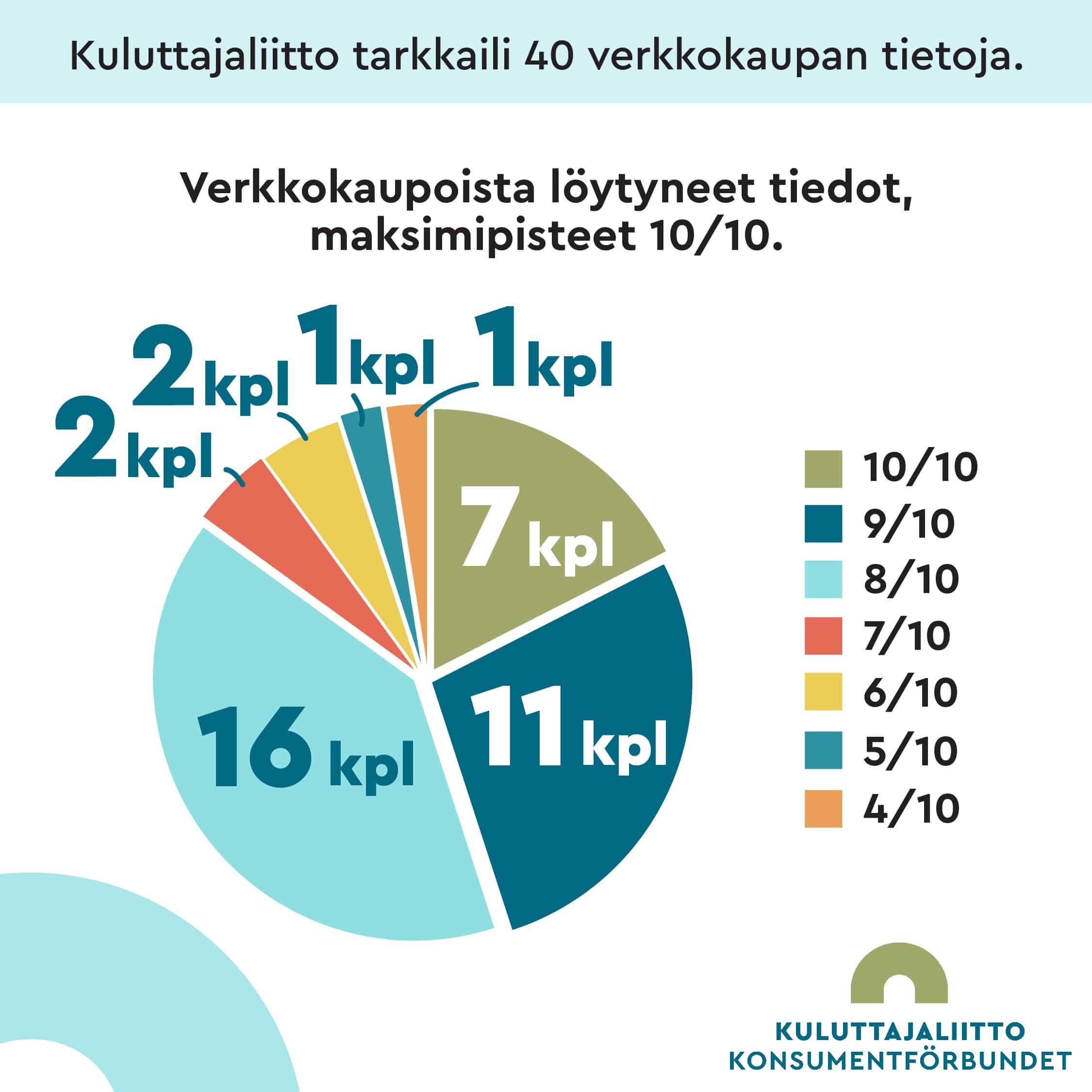 Verkkokaupoista löytyi tarkasteltuja tietoja varsin hyvin, mutta vain harvasta löytyi kaikki etsimämme tiedot. Yhteensä 40 kaupasta vain 7:stä löytyi kaikki etsimämme tiedot kohtuullisessa ajassa. Myös näistä seitsemästä suurimmasta osasta löytyi silti epäjohdonmukaisuuksia sopimusehtojen teksteistä tai jopa ristiriitoja lain kanssa. Kun tarkastuspisteitä voi saada enintään kymmenen, keskiarvo löydetyistä tiedoista oli 8,3. Keskimäärin kaksi tarvittavaa tietoa siis puuttui. Heikoimman tuloksen saaneesta kaupasta löytyi ainoastaan 4/10 etsityistä tiedoista.