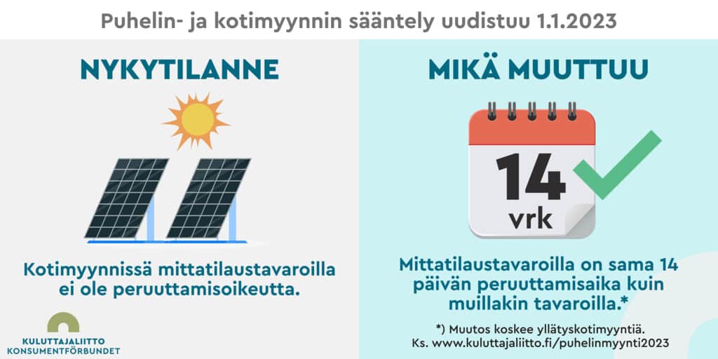 - Jatkossa myös mittatilaustavaralla on kotimyynnissä sama 14 vuorokauden peruuttamisaika kuin muillakin tavaroilla. Peruuttamisoikeus koskee vain mittatilaustavaroita, ei -palveluita. Uudistus kattaa vain ne tilanteet, joissa kuluttajan omaan kotiin tullaan täysin pyytämättä ja yllättäen.
