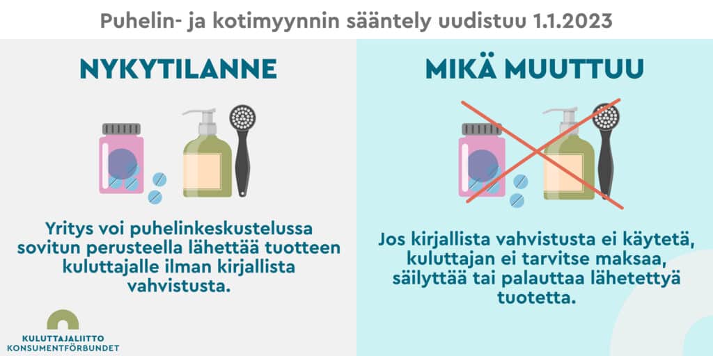 - Myyjä voi kertoa tarjouksesta puhelimessa, mutta se on joka tapauksessa lähetettävä kirjallisesti. Lisäksi puhelimessa myyjän on kerrottava, että kuluttaja ei tule sidotuksi sopimukseen eikä hänellä ole siis velvollisuutta maksaa tuotetta, ellei hänelle toimiteta kirjallista tarjousta, jonka kuluttaja vahvistaa kirjallisesti. Tämä koskee kaikkea muuta myyntiä paitsi sähköisen viestinnän palveluita (esim. puhelin- ja internetliittymät) ja kulutusluottoja.