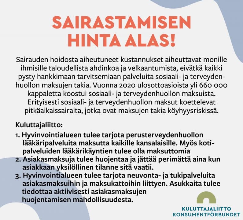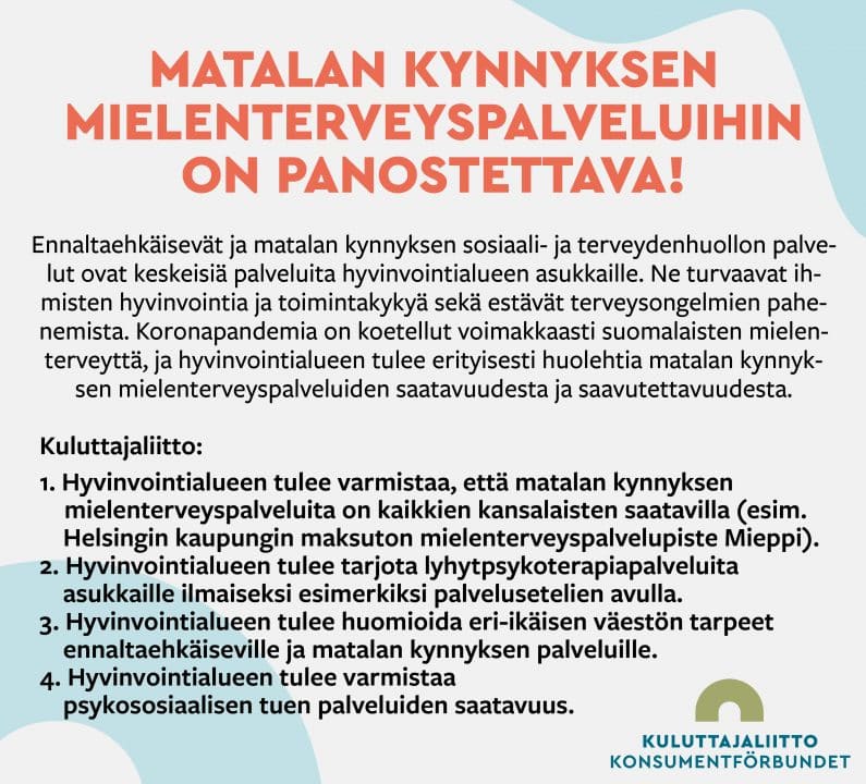 Tällä sivulla esitellyt tavoitteet pohjautuvat Kuluttajaliiton aluevaalitavoitteisiin (2022). Tutustu tavoitteisiimme klikkaamalla auki pääteemojen tavoitekortit. Lisätietoa ja taustoja teemasta pääset lukemaan kortin alla olevasta linkistä.