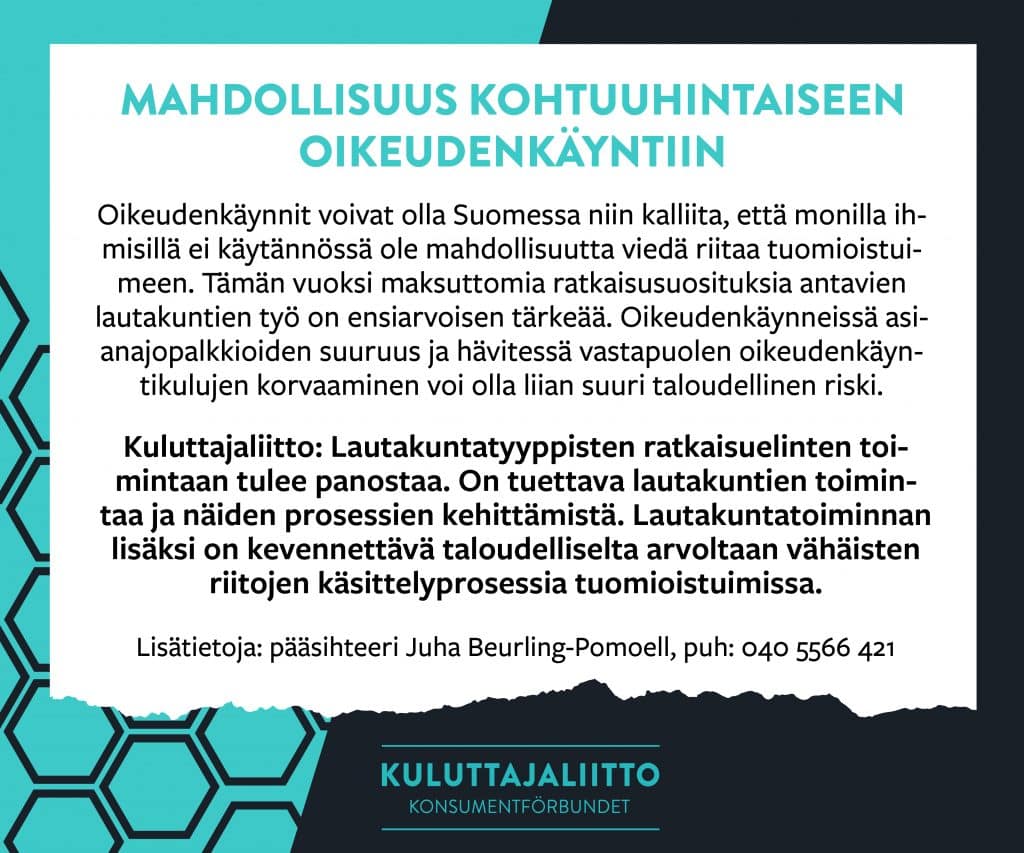 Kuluttajaliitto: Lautakuntatyyppisten ratkaisuelinten toimintaan tulee panostaa. On tuettava lautakuntien toimin- taa ja näiden prosessien kehittämistä. Lautakuntatoiminnan lisäksi on kevennettävä taloudelliselta arvoltaan vähäisten riitojen käsittelyprosessia tuomioistuimissa.