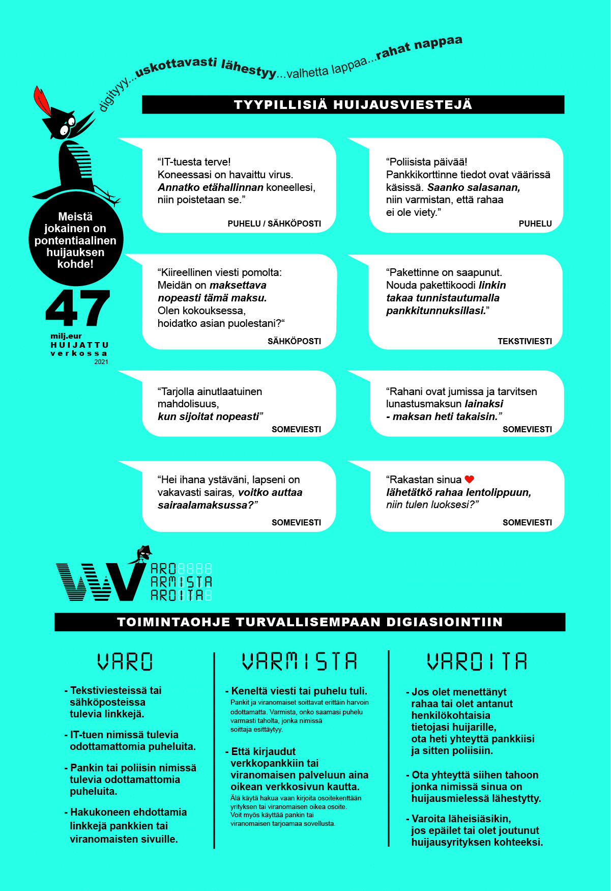 Nettihuijaukset vaikuttavat laajasti yhteiskuntaan. Vuonna 2021 poliisille tehtiin yhteensä 2 500 ilmoitusta nettihuijauksista ja suomalaiset menettivät huijauksissa noin 47 miljoonaa euroa. Summa olisi voinut olla suurempikin, mutta pankit ja viranomaiset onnistuivat estämään yli 25 milj. euron edestä varojen siirtoja huijareille ja palauttamaan varat. Viranomaisten ja yritysten yhteinen kampanja muistuttaa, että varomalla, varmistamalla ja varoittamalla muita jokainen voi torjua ja ehkäistä huijauksia myös itse.
